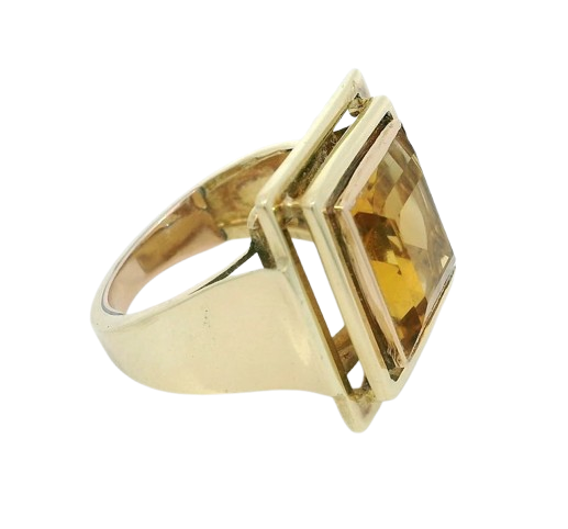 Der wunderschön geschliffene, goldgelb leuchtende Citrin, seine quadratische Form und seine Größe machen diesen Ring zu etwas Besonderem! Wenn Sie klare, geometrische Formen mögen und gerne ausgefallene Stücke tragen, sollten Sie sich diesen Ring näher ansehen! Dieser Ring macht sowohl am Ring- wie auch am Mittelfinger gute Figur!