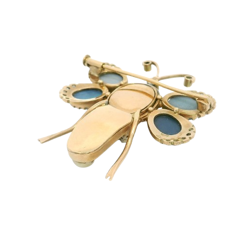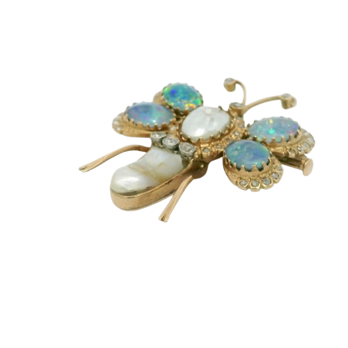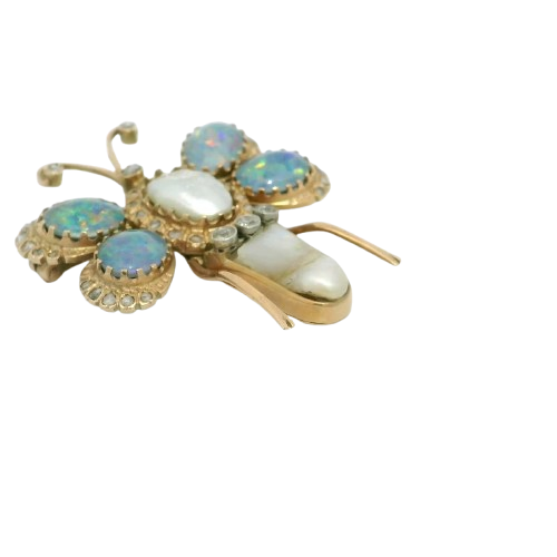 Diese bezaubernde Vintage-Brosche in Form eines Schmetterlings besteht aus Rosegold 585. Opaltripletten bringen seine Flügel zum Schimmern und sein Körper bekommt durch Perlmutt einen seidigen Glanz. Für zusätzliches Funkeln sorgen ca. 0,4 ct Altschliffdiamanten und Diamantrauten.
