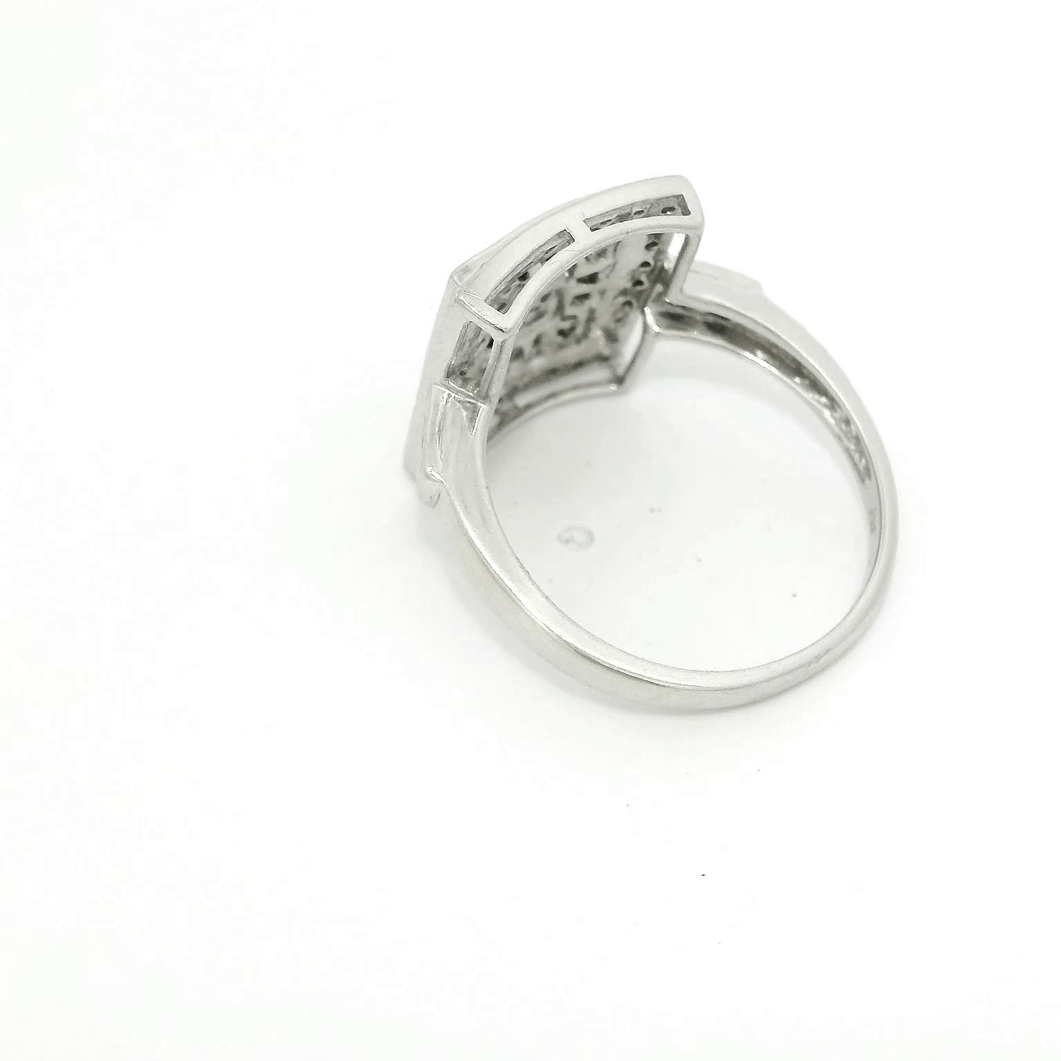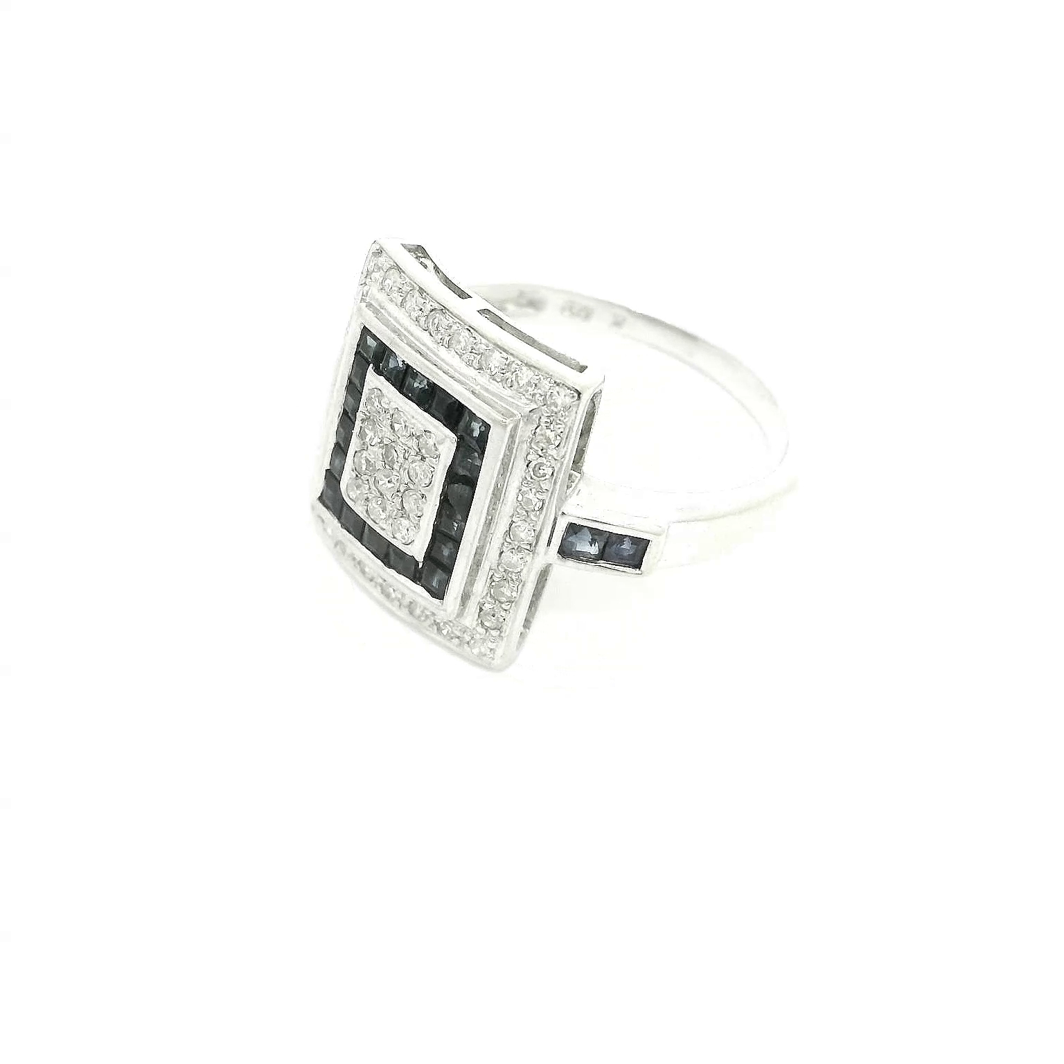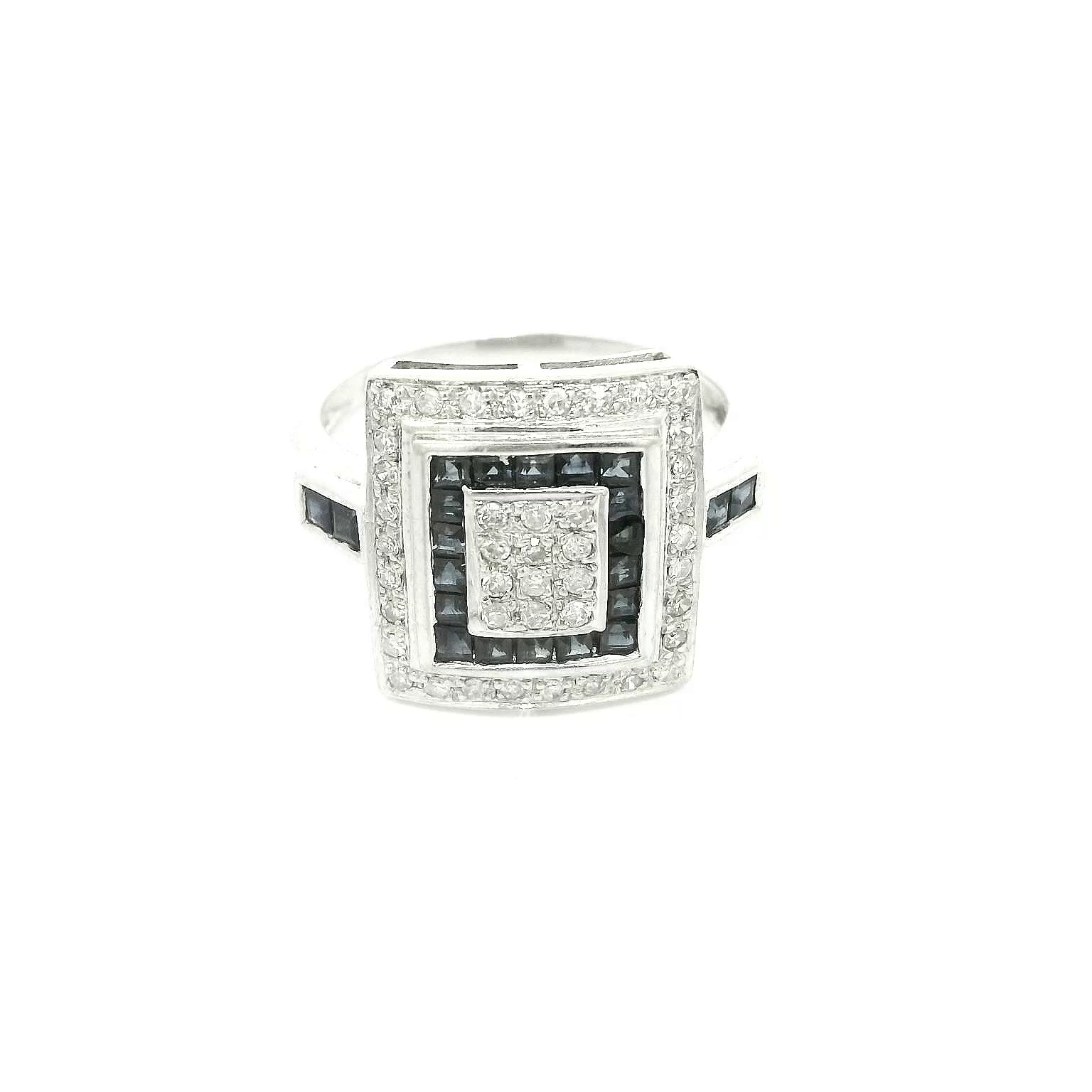 Dieser exklusive Vintage Diamantring mit Saphiren ist aus Weißgold 585 gefertigt. Sein Stil, der an das Art Deco erinnert – eine Zeit in der überwiegend geometrische Formen verwendet wurden – lässt die coole und lässige Eleganz dieser Zeit wieder aufleben. Schnörkellos, modern, edel – passt er perfekt zu einer modernen, selbstbewussten Trägerin.