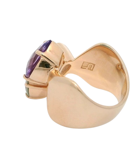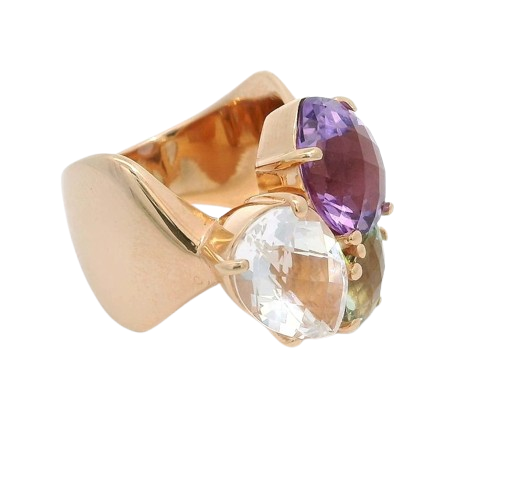 Dieser Ring hat alles was es braucht, um Ihr neues Lieblinsstück zu werden. 3 Schmucksteine (Amethyst in violett und grün – auch Prasiolith genannt- sowie Bergkristall) funkeln im wunderschönen Schachbrettschliff. Das Design ist außergewöhnlich und modisch zugleich. Durch die runde, geschwungene Form ist er extrem angenehm zu tragen und eignet sich sowohl für den Mittel- als auch für den Ringfinger.