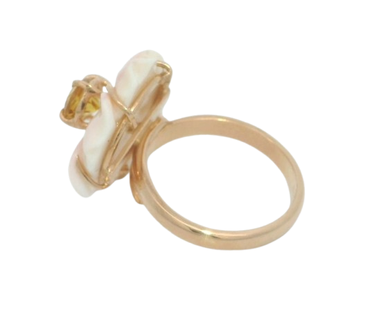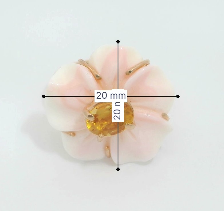 … tragen Sie am Finger, wenn Sie sich für diesen verspielten Blütenring entscheiden. Entworfen und gefertigt wurde dieses besondere Stück in einer kleinen Designwerkstatt in der Nähe von Neapel! Die rosa Muschel in Kombination mit dem Citrin zieht einfach die Blicke an!  Eher kein Ring für jeden Tag – aber ein Stück, das Sie zu besonderen Anlässen mit Freude tragen werden! Ein duftiges Sommerkleid dazu und Ihr Outfit ist perfekt!  Die Ringschiene besteht aus 925er Silber und ist rosévergoldet. Die Ringweite 55 ist verstellbar.
